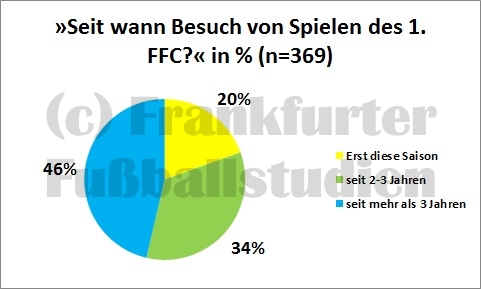 Weniger als die Hälfte der Besucher beim 1. FFC kann als Stammpublikum angesehen werden, das schon länger als drei Jahre im Frauenfußball sozialisiert ist. Etwa ein Drittel der Zuschauer kommen seit 2-3 Jahren, sie könnten im Rahmen der WM 2011 in Deutschland zum Spielbesuch motiviert und zu Anhängern geworden sein. Mit ca. 20% ist der Anteil der neuen Zuschauer in der Saison, relativ hoch. Sie dauerhaft als Anhänger zu gewinnen, gehört zu den Herausforderungen des Vereins.