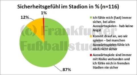 Hinsichtlich des Sicherheitsgefühls im Stadion zeigt sich, dass über 85% der Auswärtsspielbesucher sich sicher fühlen und keine Ängste haben. Dieser Wert korrespondiert mit unserer Gesamterhebung, d.h. eine überwältigende Mehrheit der Besucher fühlt sich sicher und kann die Gefahren eines Spielbesuches und das Fanverhalten einschätzen. Der höhere Anteil an Besuchern mit gelegentlichen Unsicherheits-gefühlen bei der Gruppe der Gästefans, erklärt sich über die ungewohnte Umgebung, das Polizeiaufgebot und durch Personen die sich vermutlich bei Massenveranstaltungen generell unwohl fühlen. Ebenso spielt eine Rolle, dass wenn Auseinandersetzungen stattfinden, die Gästefans in der Regel betroffen sind.